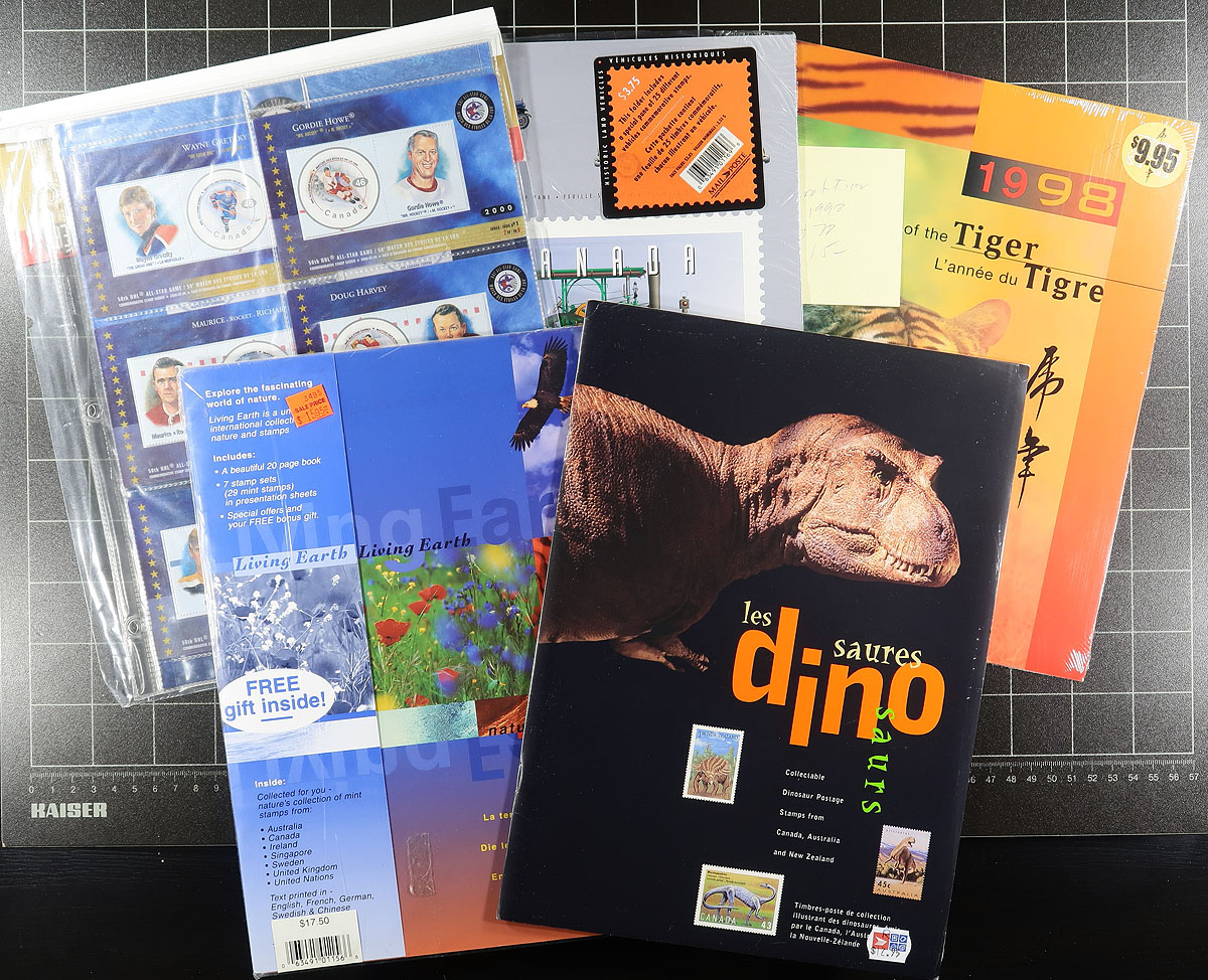 Post Office issued products consisting of Thematic Collections (mostly unopened), presentation cards, QEII anniversary folders and a whole host of various Canada Post products (mostly 1967-2012, with none of the large format annual collections). Often overlooked in their day, many produced in small quantities, once these became listed in Unitrade, demand increased and the lack of supply became apparent. There is a bit of minor duplication here, and a total catalogue value that is likely several hundred dollars. Fills a medium sized box. Estimate =