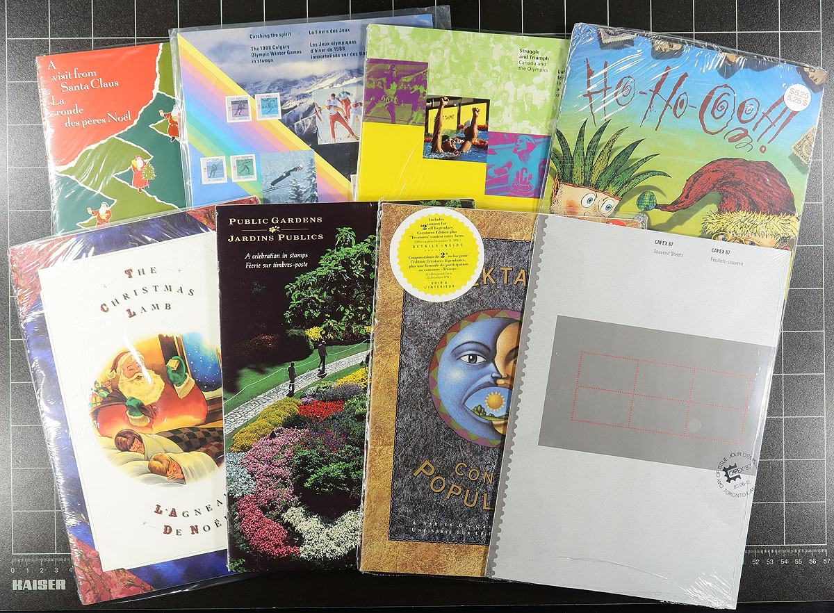 Post Office issued products consisting of Thematic Collections (mostly unopened), presentation cards, QEII anniversary folders and a whole host of various Canada Post products (mostly 1967-2012, with none of the large format annual collections). Often overlooked in their day, many produced in small quantities, once these became listed in Unitrade, demand increased and the lack of supply became apparent. There is a bit of minor duplication here, and a total catalogue value that is likely several hundred dollars. Fills a medium sized box. Estimate =
