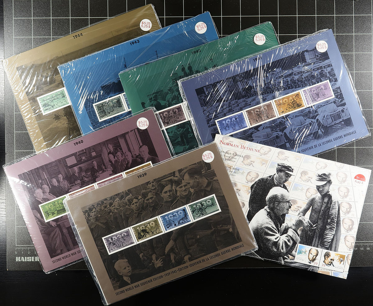 Post Office issued products consisting of Thematic Collections (mostly unopened), presentation cards, QEII anniversary folders and a whole host of various Canada Post products (mostly 1967-2012, with none of the large format annual collections). Often overlooked in their day, many produced in small quantities, once these became listed in Unitrade, demand increased and the lack of supply became apparent. There is a bit of minor duplication here, and a total catalogue value that is likely several hundred dollars. Fills a medium sized box. Estimate =