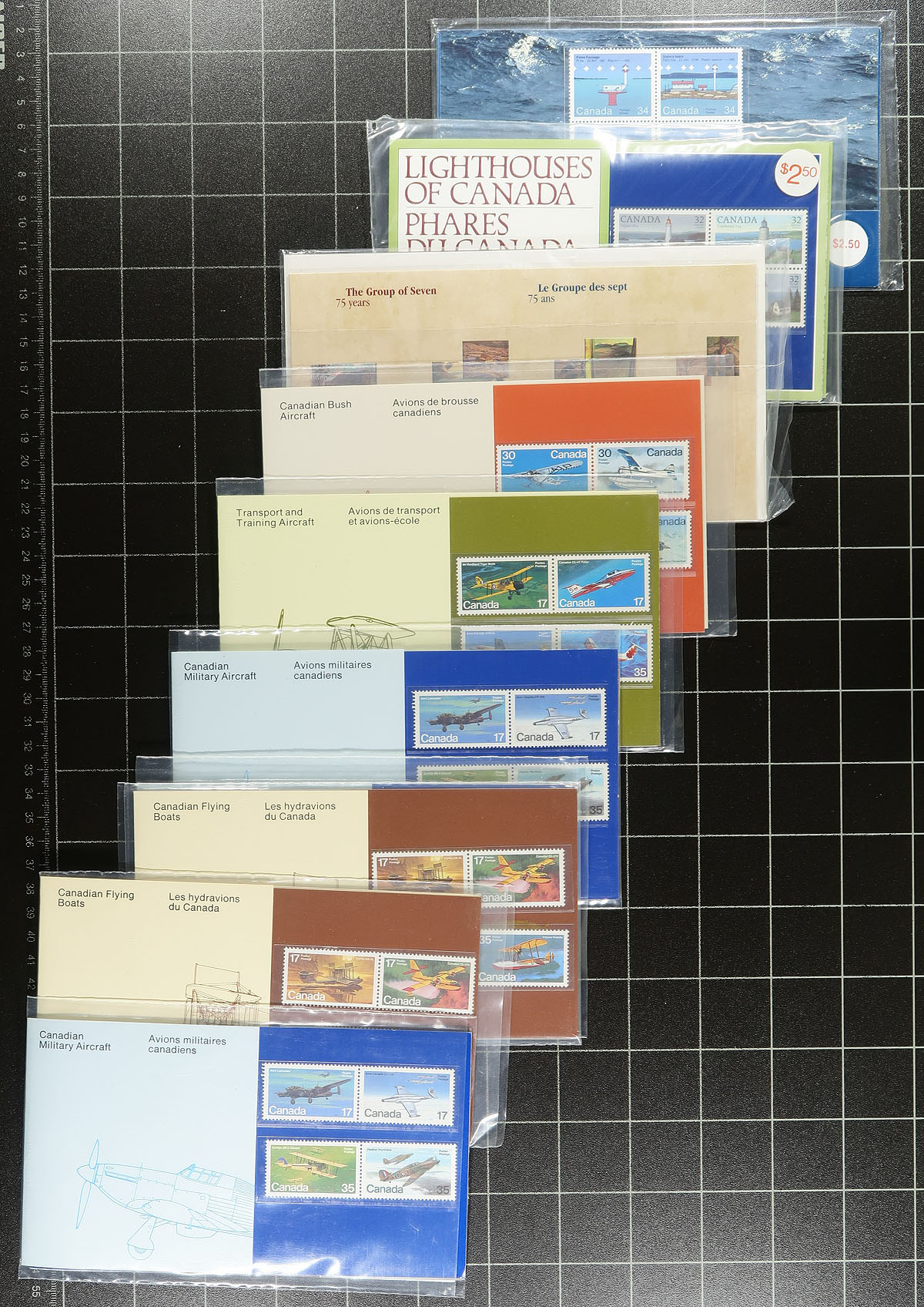 Post Office issued products consisting of Thematic Collections (mostly unopened), presentation cards, QEII anniversary folders and a whole host of various Canada Post products (mostly 1967-2012, with none of the large format annual collections). Often overlooked in their day, many produced in small quantities, once these became listed in Unitrade, demand increased and the lack of supply became apparent. There is a bit of minor duplication here, and a total catalogue value that is likely several hundred dollars. Fills a medium sized box. Estimate =