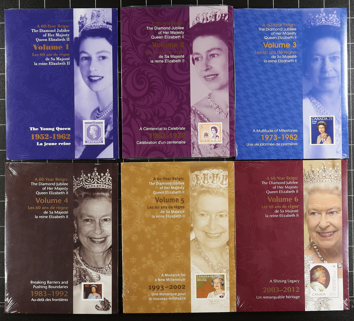 Post Office issued products consisting of Thematic Collections (mostly unopened), presentation cards, QEII anniversary folders and a whole host of various Canada Post products (mostly 1967-2012, with none of the large format annual collections). Often overlooked in their day, many produced in small quantities, once these became listed in Unitrade, demand increased and the lack of supply became apparent. There is a bit of minor duplication here, and a total catalogue value that is likely several hundred dollars. Fills a medium sized box. Estimate =