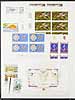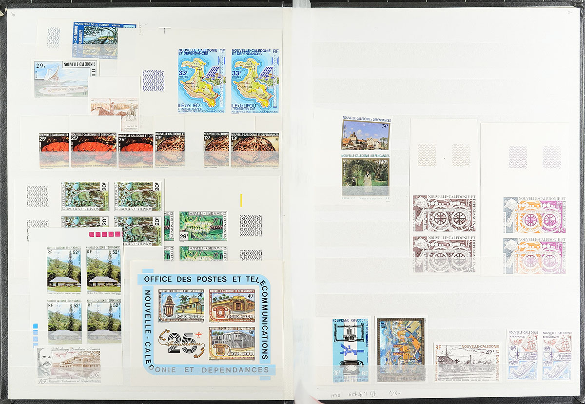 New Caledonia and Wallis and Futuna mint hinged imperforate issues in singles and pairs (a couple larger) with 1979-1984 issues. There are 28 stamps from New Caledonia, 44 from Wallis and Futana, including singles, sets and some duplicates, not counted in the above numbers. Both regular issue and airmail. Mentioned as a footnote in Scott, but with no guidance on pricing. All assembled in a 16-page stockbook. Estimate =