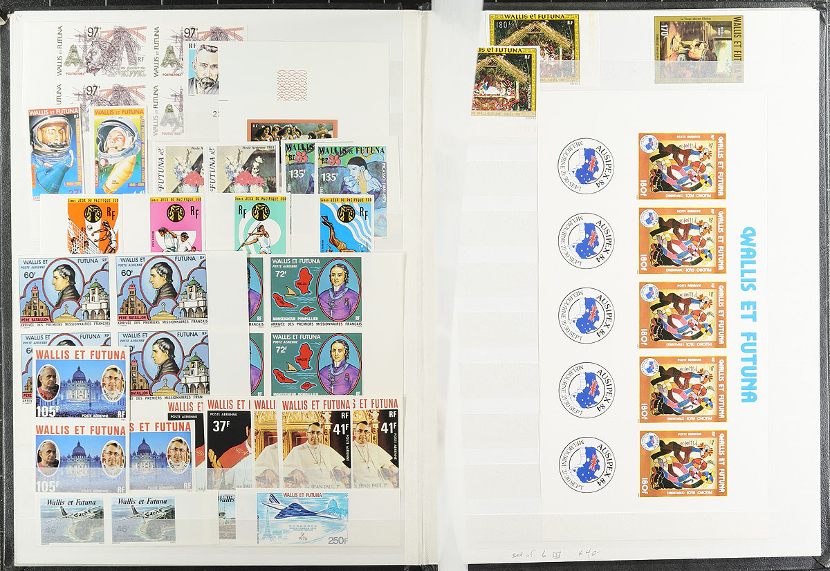 New Caledonia and Wallis and Futuna mint hinged imperforate issues in singles and pairs (a couple larger) with 1979-1984 issues. There are 28 stamps from New Caledonia, 44 from Wallis and Futana, including singles, sets and some duplicates, not counted in the above numbers. Both regular issue and airmail. Mentioned as a footnote in Scott, but with no guidance on pricing. All assembled in a 16-page stockbook. Estimate =