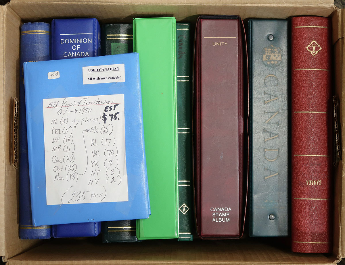 U-Haul box with seven collections, or partial collections in an assortment of binders and albums. Mostly used, going back to the Small Queen era and running into the 1990's, this group offers the chance for cancel and variety hunters, collection builders and people looking to pick up an older album or two in good condition (e.g. Minkus, Lighthouse). A few thousand stamps, lots of catalogue value and some duplication. Overall condition looks to be pretty good. Many of these albums were once individual auction lots (and haven’t been touched since). Estimate =