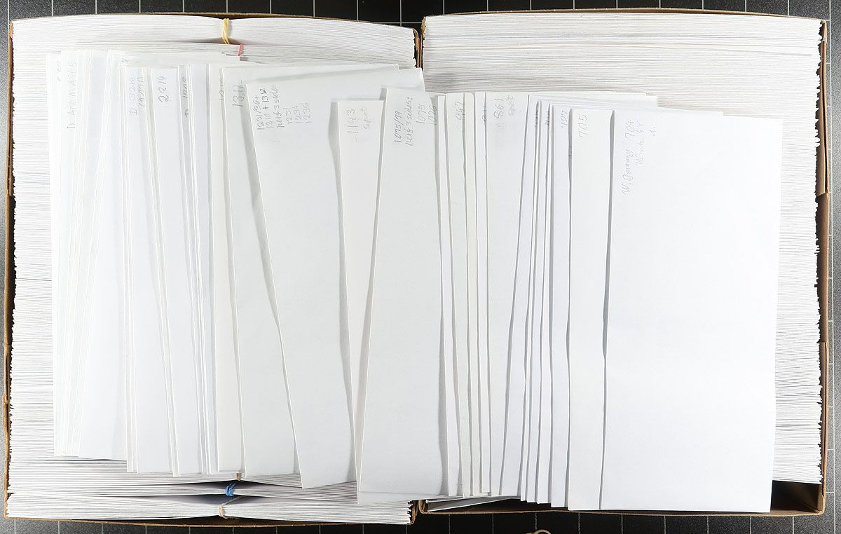 A pair of envelope boxes with a well-organized assortment of used and mint stamps from Germany, Berlin, Austria, Faroe Islands, Greenland, Iceland, Norway, Sweden, Great Britain and Canada, mostly second half of the 20th century, with a bit from the "back of the book". All in #10 envelopes with one issue per envelope with Scott number penciled in the upper corner. Alas, this is often one stamp per envelope, meaning the 1000 envelopes aren’t as full as we would normally see. Estimate =