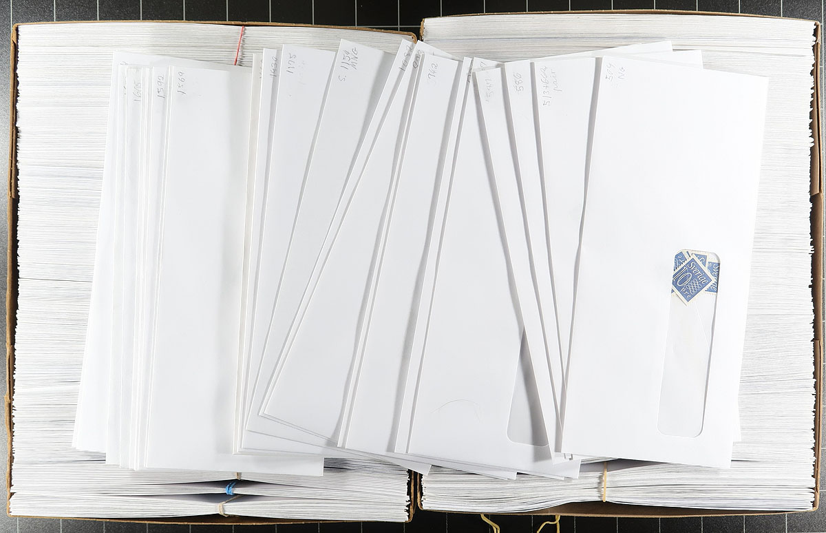 A pair of envelope boxes with a well-organized assortment of used and mint stamps from Germany, Berlin, Austria, Faroe Islands, Greenland, Iceland, Norway, Sweden, Great Britain and Canada, mostly second half of the 20th century, with a bit from the "back of the book". All in #10 envelopes with one issue per envelope with Scott number penciled in the upper corner. Alas, this is often one stamp per envelope, meaning the 1000 envelopes aren’t as full as we would normally see. Estimate =