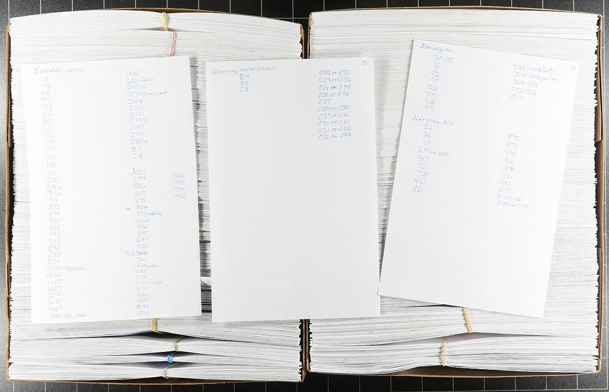 A pair of envelope boxes with a well-organized assortment of used and mint stamps from Germany, Berlin, Austria, Faroe Islands, Greenland, Iceland, Norway, Sweden, Great Britain and Canada, mostly second half of the 20th century, with a bit from the "back of the book". All in #10 envelopes with one issue per envelope with Scott number penciled in the upper corner. Alas, this is often one stamp per envelope, meaning the 1000 envelopes aren’t as full as we would normally see. Estimate =