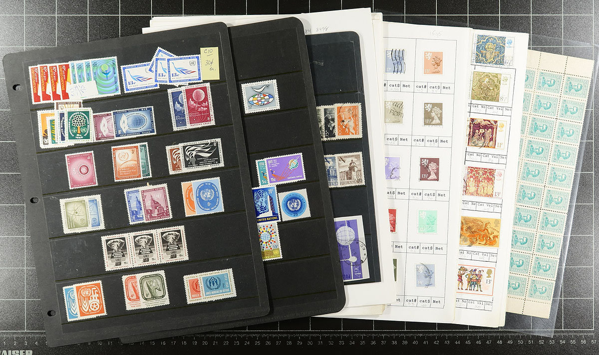 Bankers box of albums and loose pages. Noted some nice southern Africa (e.g. Botswana), a Minkus Supreme binder full of middle eastern "Sand Dune" issues with their usual topical appeal, with more Yemen, and then a series of loose pages, often one page per subject or country, with USA, British Commonwealth (saw a page with some nice KGV Sierra Leone town cancels). Finishes with a sparsely populated 32-page stockbook which you can use to sort this all out. Estimate =