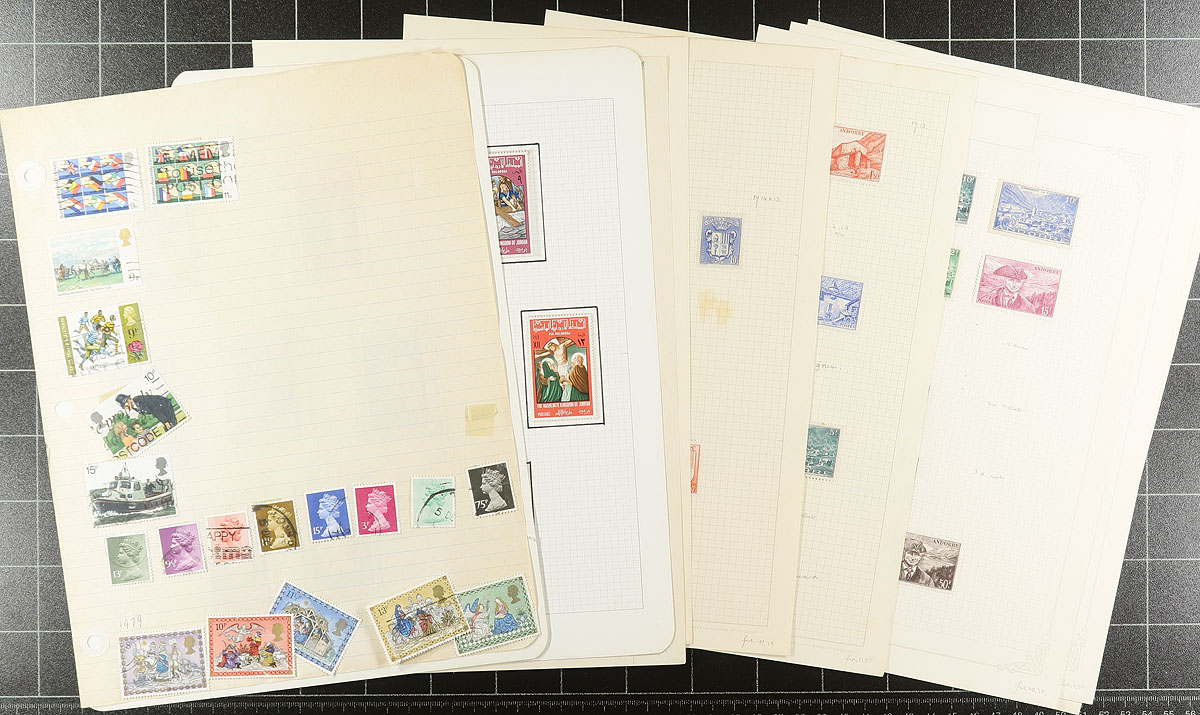 Bankers box of albums and loose pages. Noted some nice southern Africa (e.g. Botswana), a Minkus Supreme binder full of middle eastern "Sand Dune" issues with their usual topical appeal, with more Yemen, and then a series of loose pages, often one page per subject or country, with USA, British Commonwealth (saw a page with some nice KGV Sierra Leone town cancels). Finishes with a sparsely populated 32-page stockbook which you can use to sort this all out. Estimate =