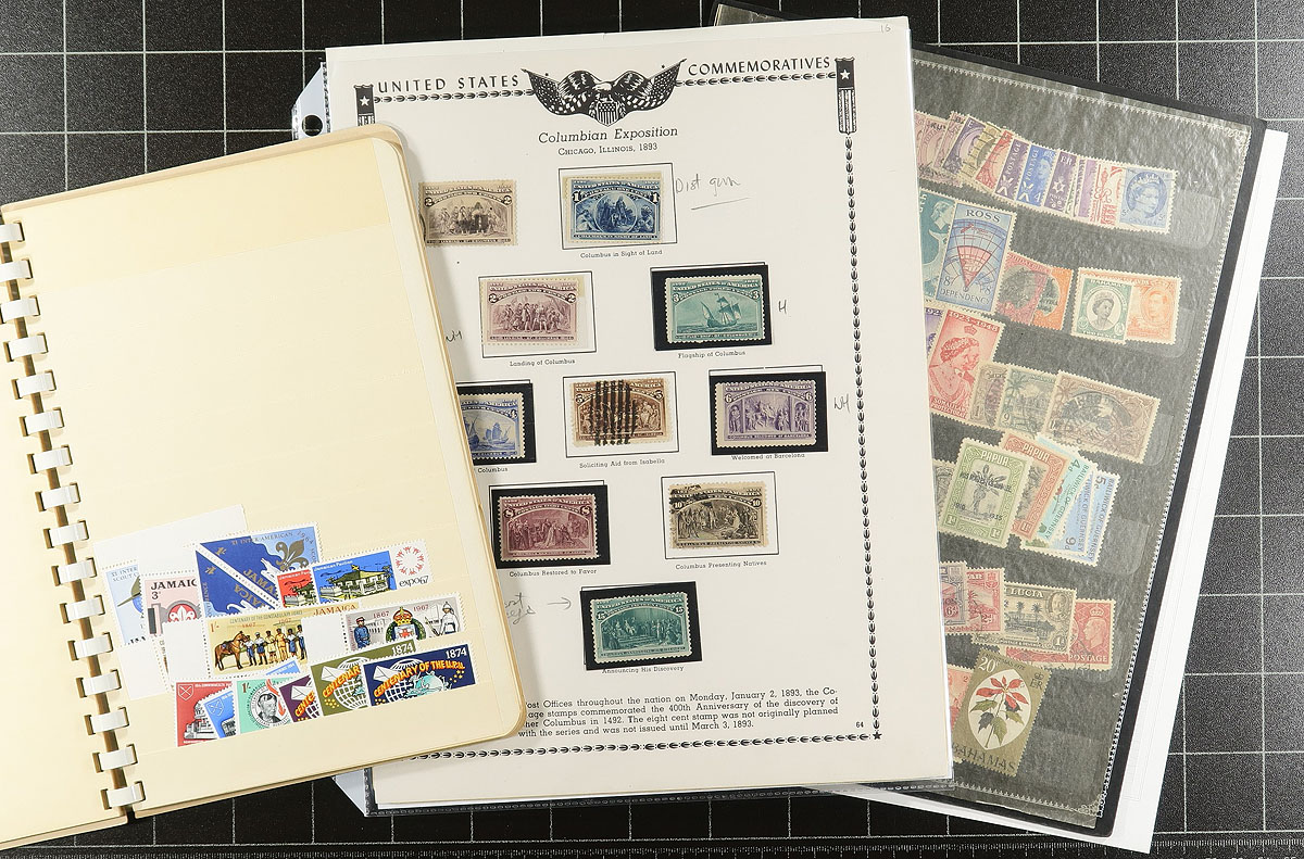 Bankers box of albums and loose pages. Noted some nice southern Africa (e.g. Botswana), a Minkus Supreme binder full of middle eastern "Sand Dune" issues with their usual topical appeal, with more Yemen, and then a series of loose pages, often one page per subject or country, with USA, British Commonwealth (saw a page with some nice KGV Sierra Leone town cancels). Finishes with a sparsely populated 32-page stockbook which you can use to sort this all out. Estimate =