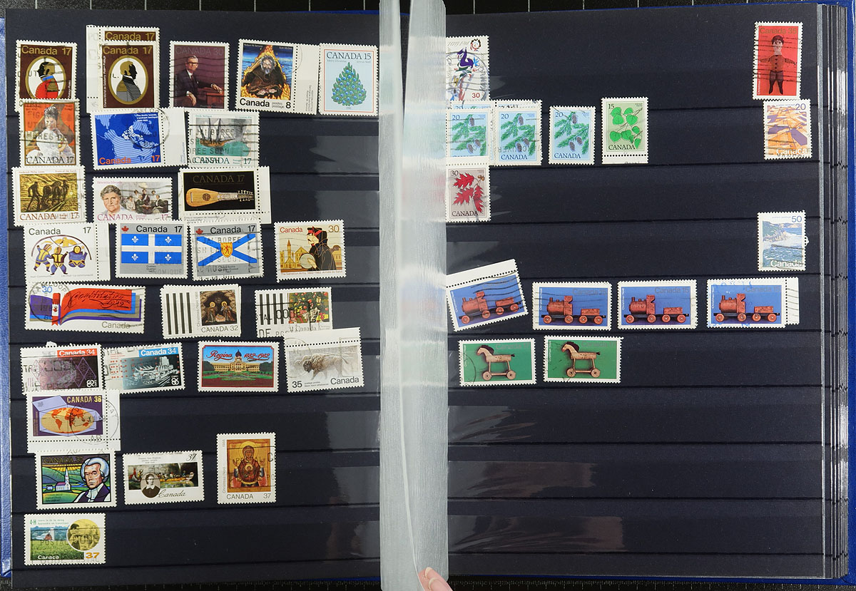 Bankers box of albums and loose pages. Noted some nice southern Africa (e.g. Botswana), a Minkus Supreme binder full of middle eastern "Sand Dune" issues with their usual topical appeal, with more Yemen, and then a series of loose pages, often one page per subject or country, with USA, British Commonwealth (saw a page with some nice KGV Sierra Leone town cancels). Finishes with a sparsely populated 32-page stockbook which you can use to sort this all out. Estimate =