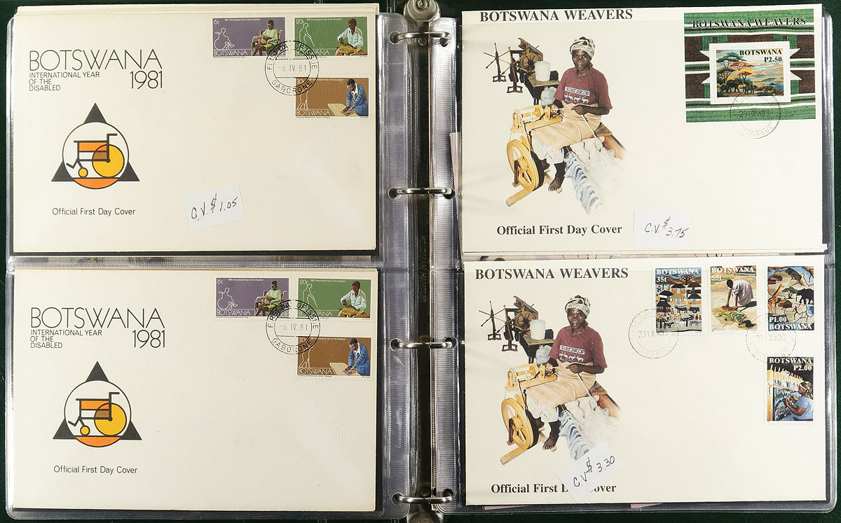 Bankers box of albums and loose pages. Noted some nice southern Africa (e.g. Botswana), a Minkus Supreme binder full of middle eastern "Sand Dune" issues with their usual topical appeal, with more Yemen, and then a series of loose pages, often one page per subject or country, with USA, British Commonwealth (saw a page with some nice KGV Sierra Leone town cancels). Finishes with a sparsely populated 32-page stockbook which you can use to sort this all out. Estimate =