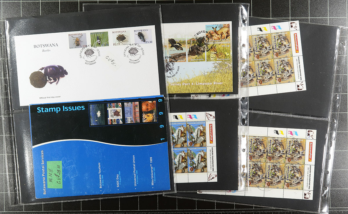 Bankers box of albums and loose pages. Noted some nice southern Africa (e.g. Botswana), a Minkus Supreme binder full of middle eastern "Sand Dune" issues with their usual topical appeal, with more Yemen, and then a series of loose pages, often one page per subject or country, with USA, British Commonwealth (saw a page with some nice KGV Sierra Leone town cancels). Finishes with a sparsely populated 32-page stockbook which you can use to sort this all out. Estimate =