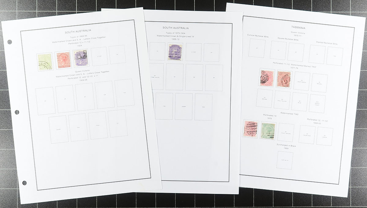 Some assembly is required for this collection. Comes with a couple of sets of computer-generated pages for all six stamp-issuing states (there are some stamps on one set, the other is completely empty). To help you fill these pages are several groups of over 300 stamps from a number of sources. Includes some higher values, lots of nice cancels and a quartet of various "Specimen" overprints. Perfect to help you develop your expertise. Estimate =