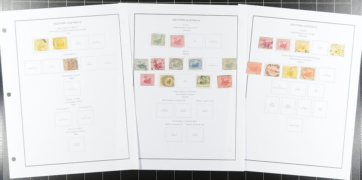 Some assembly is required for this collection. Comes with a couple of sets of computer-generated pages for all six stamp-issuing states (there are some stamps on one set, the other is completely empty). To help you fill these pages are several groups of over 300 stamps from a number of sources. Includes some higher values, lots of nice cancels and a quartet of various "Specimen" overprints. Perfect to help you develop your expertise. Estimate =