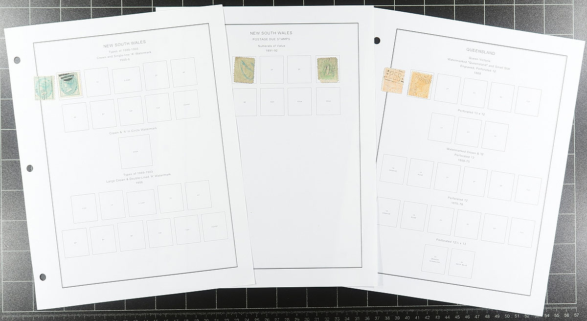 Some assembly is required for this collection. Comes with a couple of sets of computer-generated pages for all six stamp-issuing states (there are some stamps on one set, the other is completely empty). To help you fill these pages are several groups of over 300 stamps from a number of sources. Includes some higher values, lots of nice cancels and a quartet of various "Specimen" overprints. Perfect to help you develop your expertise. Estimate =