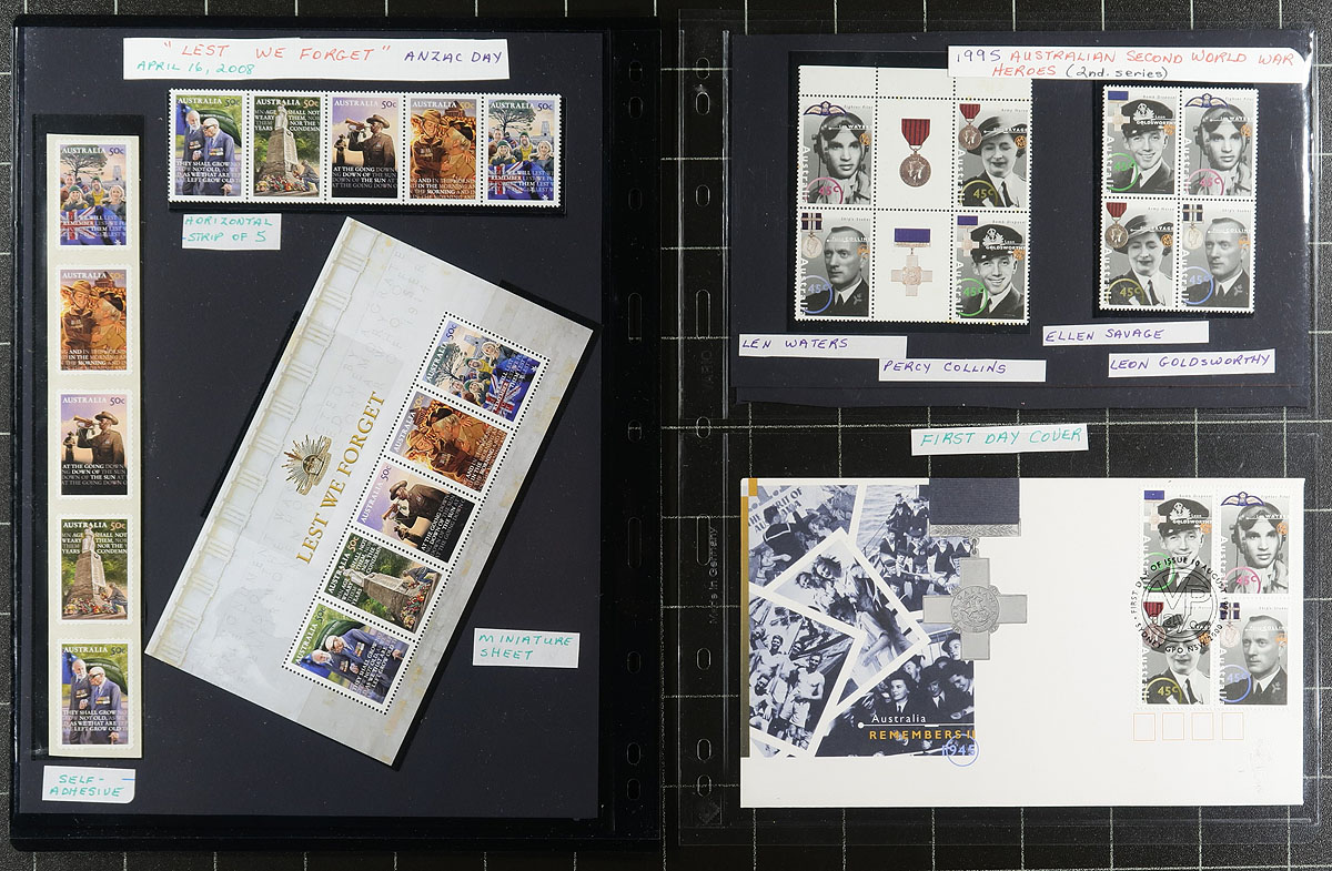Mint morass in a binder. There are some earlier, such as a dozen fresh looking King George V "Heads" to 1/4, and a trio of green and red postage dues. The original decimal Explorers are here (missing the two values that were issued later), and a handful of modern "Specimen" overprints. There is a hit-or-miss offering of 1930’s-2000 issues (including some 1980's Antarctic Territories (AAT) and a group of 2000's WWII/Victoria Cross issues. Lots of catalogue value here, and lots of face value. The later material appears to all be never hinged. Estimate =