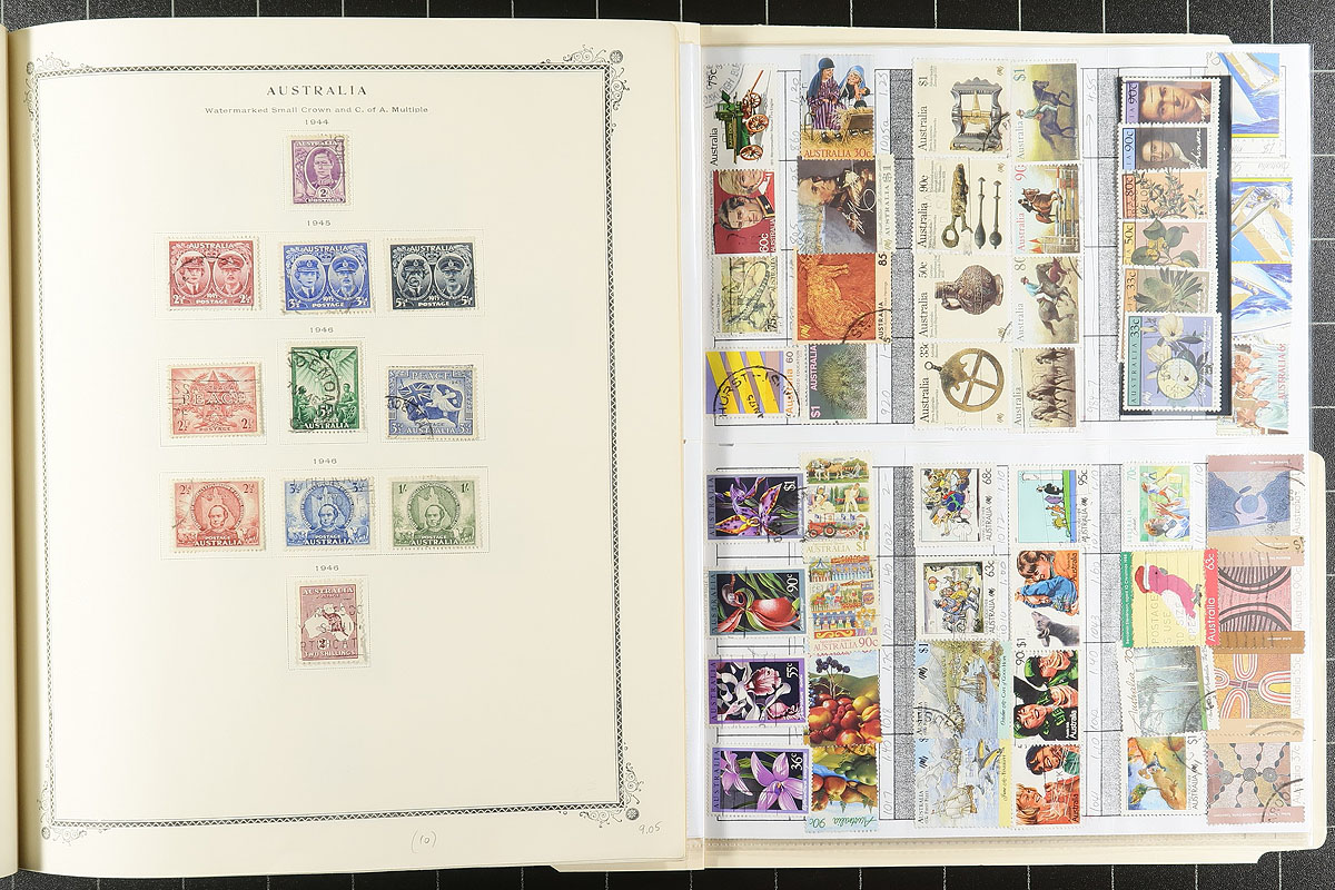 A handful of nearly a century of used Australia on pages and a few cards. Didn’t see any ‘Roos, but there are lots of King George V "Heads" (including a quintet of "OS" overprints), followed by fairly steady coverage from the 1930's right up to 2017. Because this material is from a variety of sources, some overlap and gaps can be expected, with some minor faults. The various owners’ recent catalogue values total over US$1500.00. Estimate =