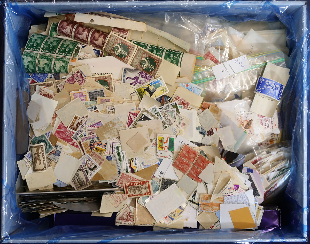 All that was left from this collector’s stamp area filling a bankers box. On and off paper: loose, in baggies, glassines, a chocolate box. Spread over many countries and many decades, with no apparent concentration of anything. This diverse lot is offered as received. Tens of thousands of stamps. Estimate =
