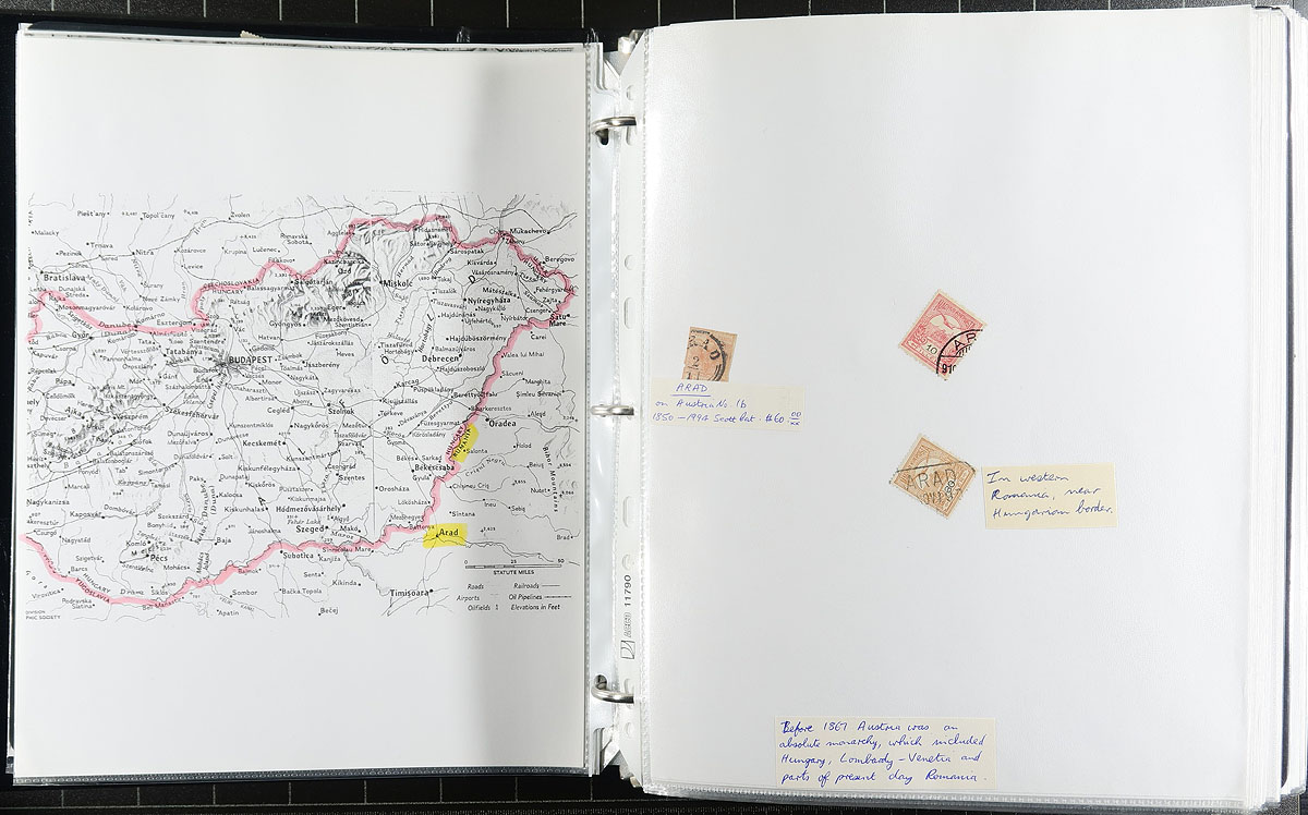 A complete two binder collection of a Post Office cancellation study, with a couple hundred stamps and over 100 covers, from the 1880's-1980's. Most are identified on blank pages in a page protector, many have maps showing the town’s location. The lot has a bonus of 75 perfin stamps with a few private perfins and a larger group of "triangle" perfins from the 1921-1924 period. A neat lot to build a nice town cancel collection. Estimate =