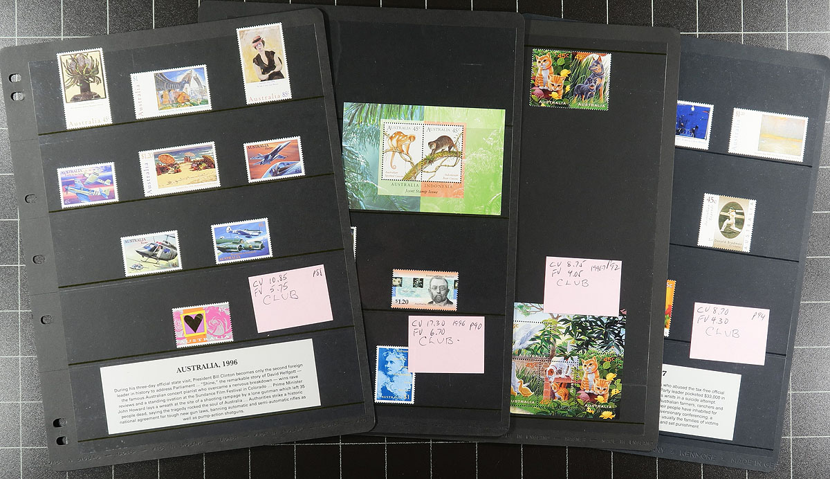Very well-organized collection of mint Never Hinged commemoratives ranging between the years 1966 to 1998. Noted some of the better sets and consists of 1,010 stamps and 26 souvenir sheets/mini-sheets. All housed on 62 Hagner pages, 5 single sided pages and 57 double sided. Pages, if new, would cost $200.00, alone. Australian face value AUD$504.52 in Canadian dollars =