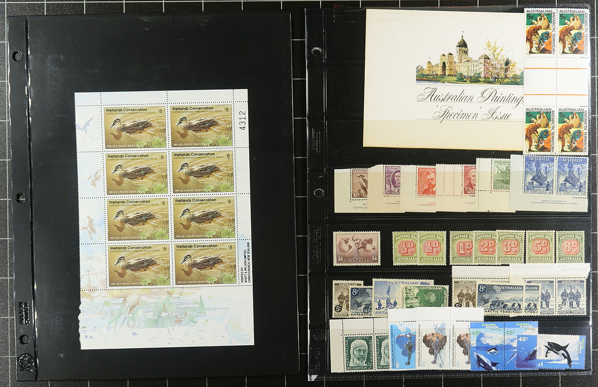 A fun lot of mint stamps from "down under", with a series of single pages (mostly former bid board lots), with a good range of 1960's-1970's issues, a Wetlands Conservation "duck stamp" sheetlet, a bit of postage dues and Antarctic Territory. Some modern "gutter pairs" and older "imprint" blocks, some mounted material from 1992-1993 (face A$50) and a bit of "old school" stock. The catalogue value here adds up quickly. Estimate =