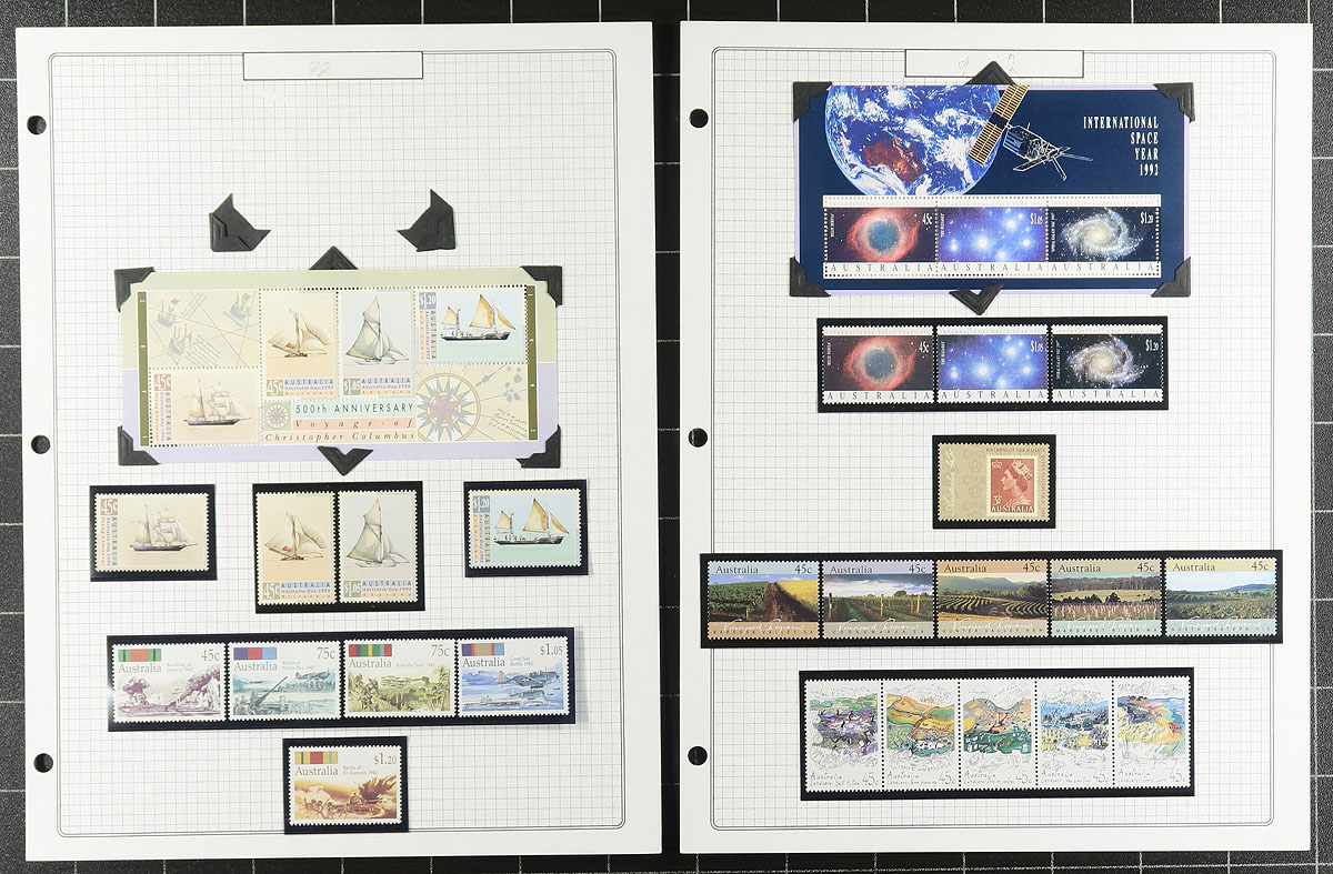 A fun lot of mint stamps from "down under", with a series of single pages (mostly former bid board lots), with a good range of 1960's-1970's issues, a Wetlands Conservation "duck stamp" sheetlet, a bit of postage dues and Antarctic Territory. Some modern "gutter pairs" and older "imprint" blocks, some mounted material from 1992-1993 (face A$50) and a bit of "old school" stock. The catalogue value here adds up quickly. Estimate =