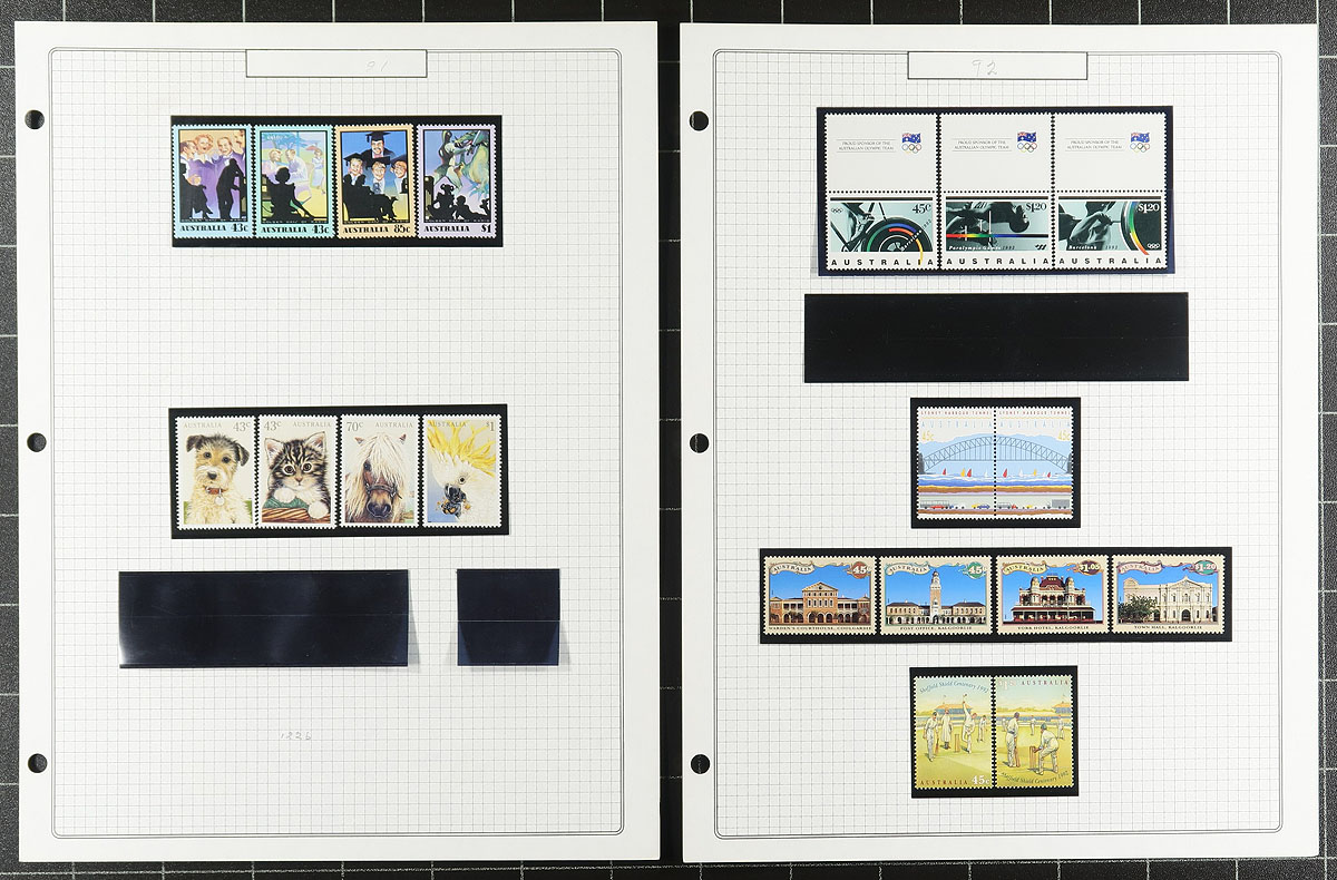 A fun lot of mint stamps from "down under", with a series of single pages (mostly former bid board lots), with a good range of 1960's-1970's issues, a Wetlands Conservation "duck stamp" sheetlet, a bit of postage dues and Antarctic Territory. Some modern "gutter pairs" and older "imprint" blocks, some mounted material from 1992-1993 (face A$50) and a bit of "old school" stock. The catalogue value here adds up quickly. Estimate =