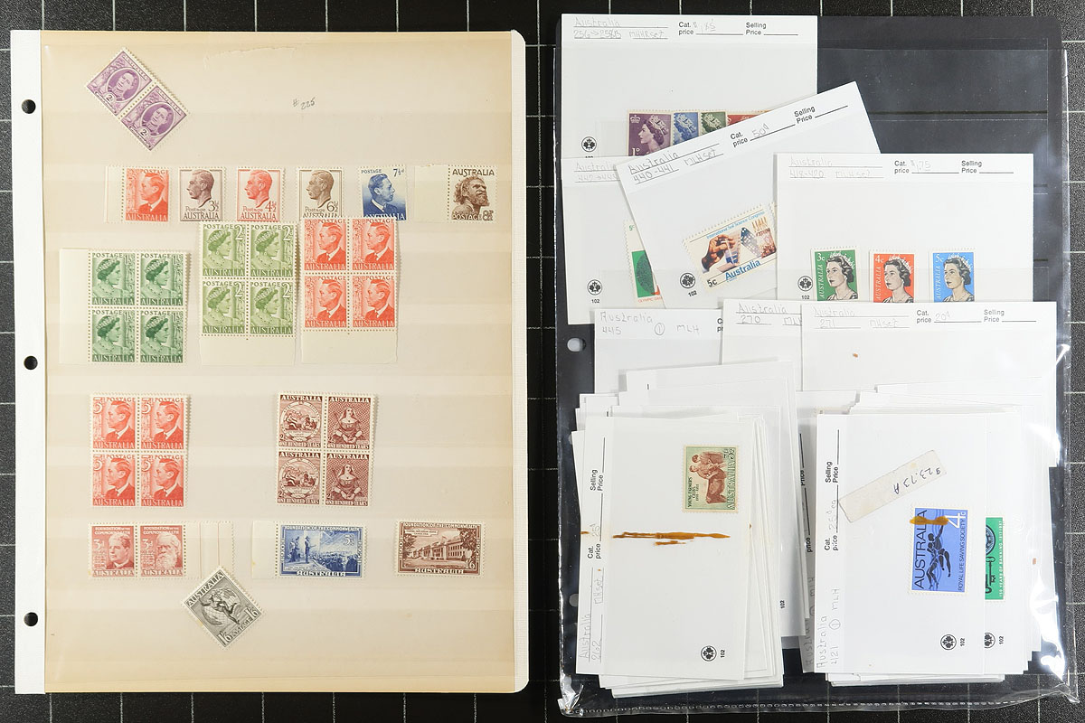 A fun lot of mint stamps from "down under", with a series of single pages (mostly former bid board lots), with a good range of 1960's-1970's issues, a Wetlands Conservation "duck stamp" sheetlet, a bit of postage dues and Antarctic Territory. Some modern "gutter pairs" and older "imprint" blocks, some mounted material from 1992-1993 (face A$50) and a bit of "old school" stock. The catalogue value here adds up quickly. Estimate =