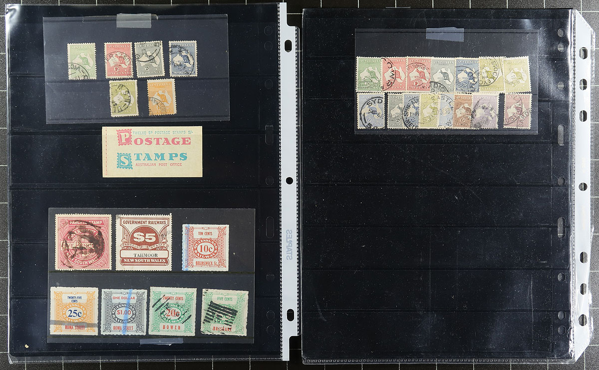 A small bundle of used on pages, the most valuable being from the States, mostly on one chaotic page covering all six states. Some early ‘Roos and King George V "Heads" are supplemented with a scattering of issues to about 2000, including some "back of the book". There is a complete booklet from 1966 with CTO panes and a group of seven railway revenues. The owners’ catalogue value is over US$1200.00. Estimate =