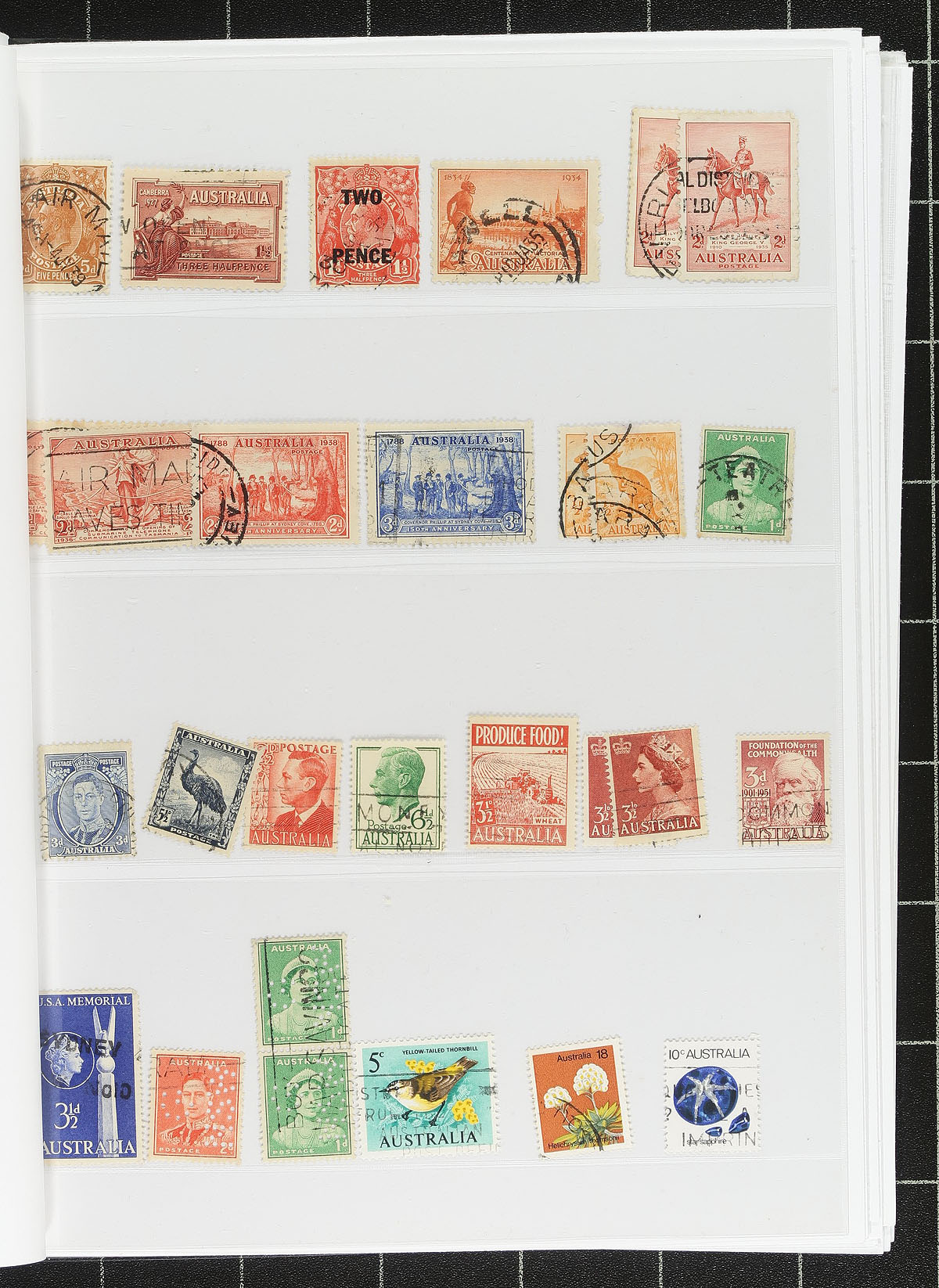 A small bundle of used on pages, the most valuable being from the States, mostly on one chaotic page covering all six states. Some early ‘Roos and King George V "Heads" are supplemented with a scattering of issues to about 2000, including some "back of the book". There is a complete booklet from 1966 with CTO panes and a group of seven railway revenues. The owners’ catalogue value is over US$1200.00. Estimate =