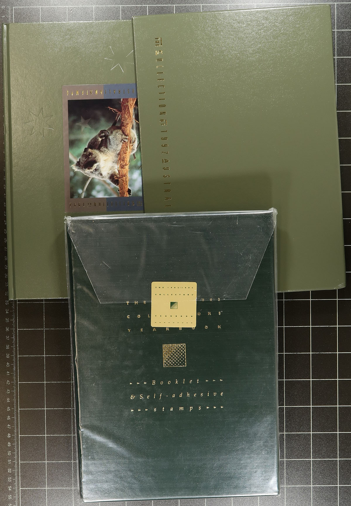 Seven "annual collections" (1982, 1985-88, 1991-1992) and a trio of "Frama, Booklet and Self-Adhesive Collections" (1990-91, 1991-92, 1992-93). Some are unopened, the rest are in good condition (most are in their original sleeves). All have their full complement of stamps. Australian retail A$625.00, indicating a hefty amount of face value. Estimate =
