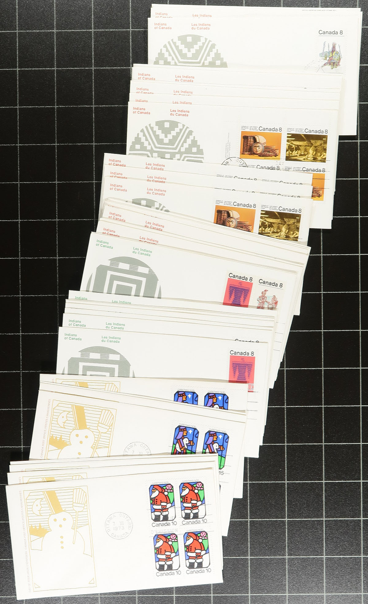 First Day Covers. Canada Post First Day Cover cachet holding #1: A few hundred, standard issue first day covers, with a few larger being for larger plate blocks and souvenir sheets. All with cachet, all are unaddressed and few faults are to be expected. Strength from 1971 to the 1990's, but with a few here and there into the 2000's. Some duplication. Substantial original cost and enormous catalogue value. Estimate =