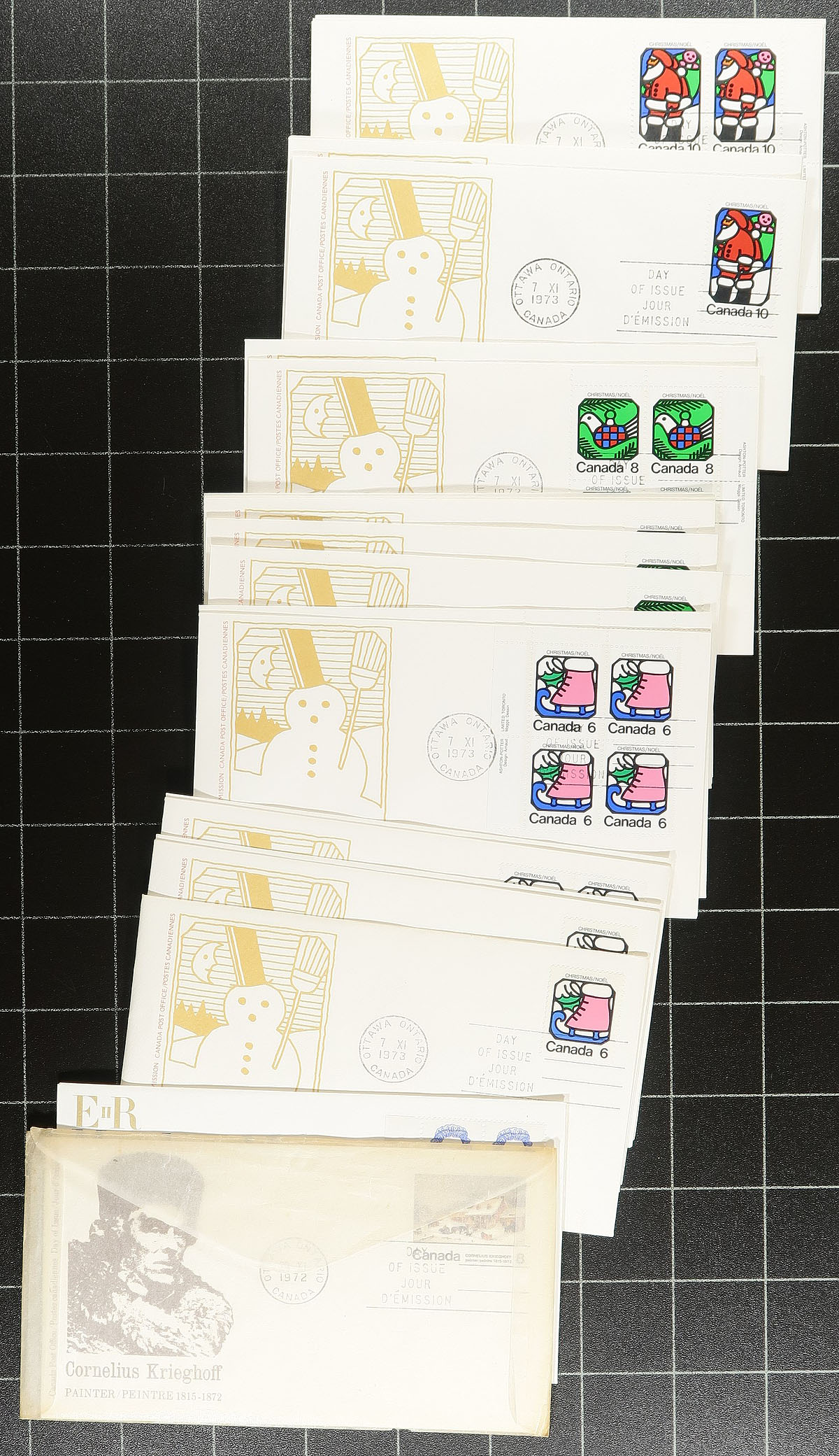 First Day Covers. Canada Post First Day Cover cachet holding #1: A few hundred, standard issue first day covers, with a few larger being for larger plate blocks and souvenir sheets. All with cachet, all are unaddressed and few faults are to be expected. Strength from 1971 to the 1990's, but with a few here and there into the 2000's. Some duplication. Substantial original cost and enormous catalogue value. Estimate =