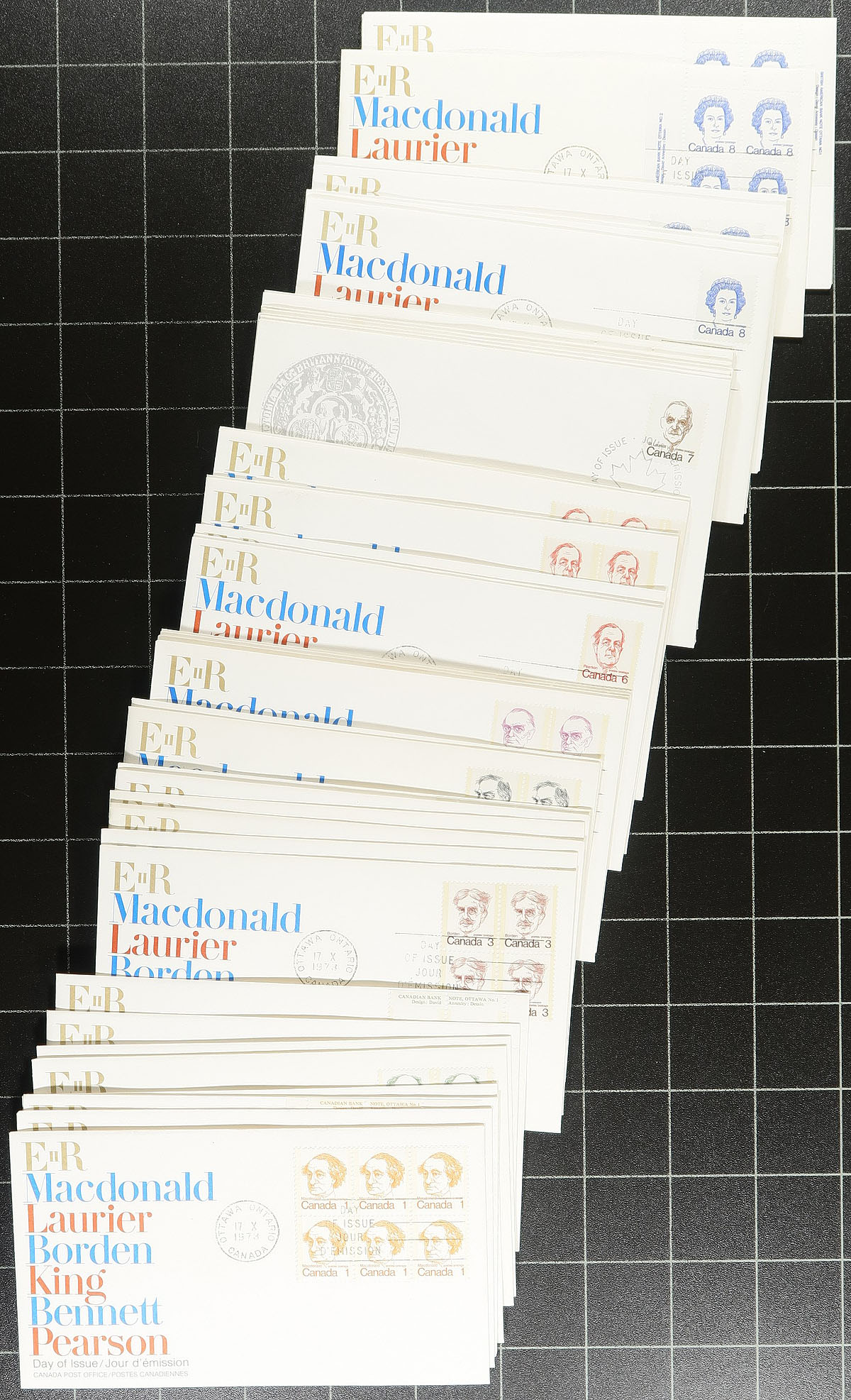 First Day Covers. Canada Post First Day Cover cachet holding #1: A few hundred, standard issue first day covers, with a few larger being for larger plate blocks and souvenir sheets. All with cachet, all are unaddressed and few faults are to be expected. Strength from 1971 to the 1990's, but with a few here and there into the 2000's. Some duplication. Substantial original cost and enormous catalogue value. Estimate =