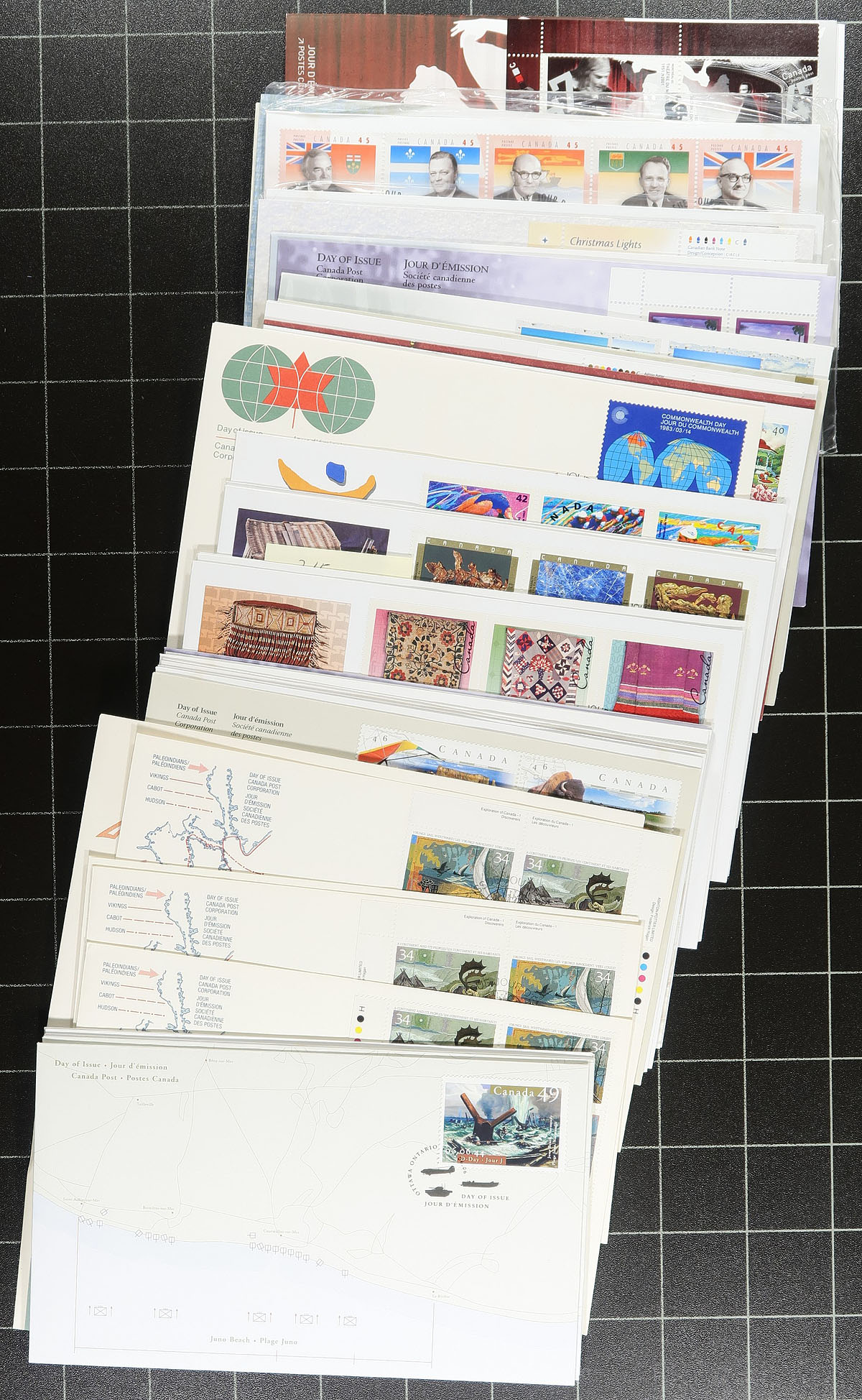 First Day Covers. Canada Post First Day Cover cachet holding #2: A few hundred, standard issue first day covers, with a few larger being for larger plate blocks and souvenir sheets. All with cachet, all are unaddressed and few faults are to be expected. Coverage from 1971 to about 2006, but with substantial coverage of the 1990's-early 2000's. Some duplication. Substantial original cost and enormous catalogue value. Estimate =