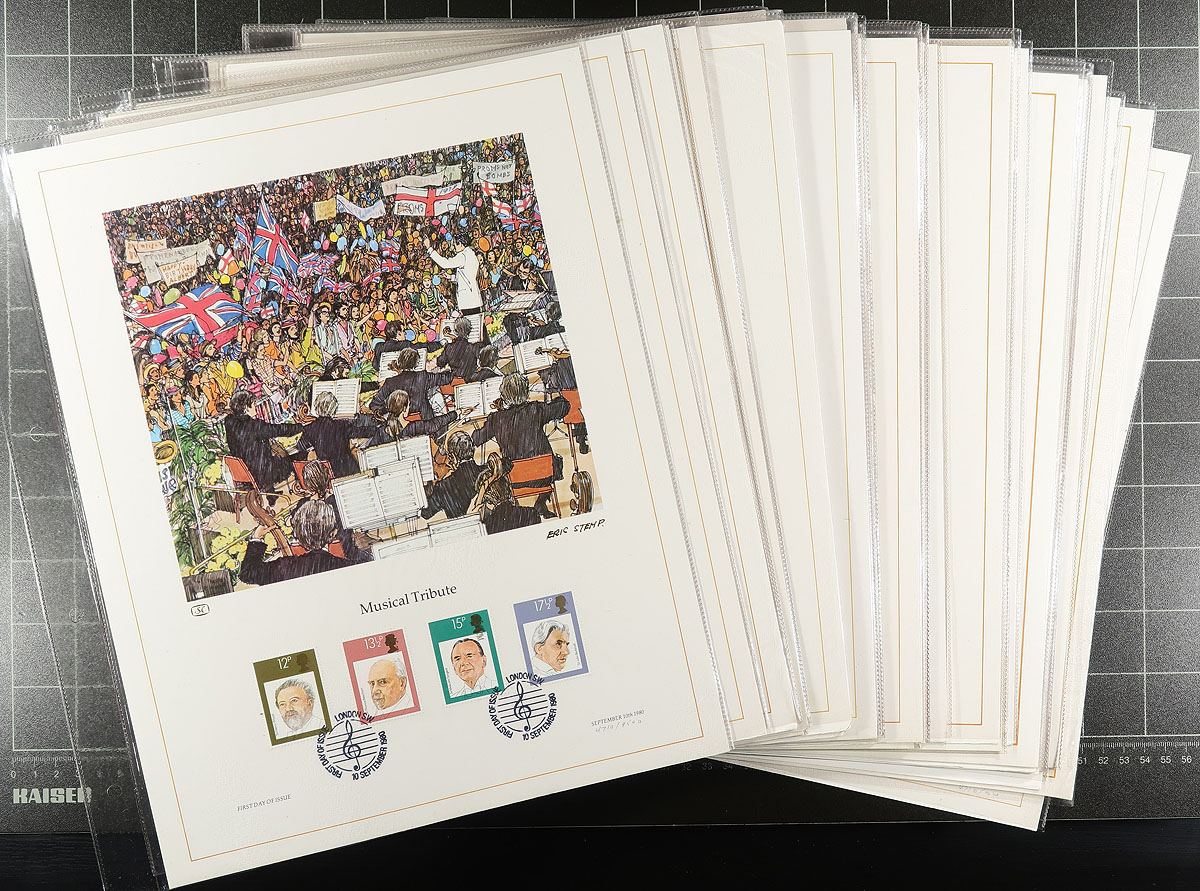 Large sized lithographed prints, with matching stamps and first day cancels. 28 different British panels (1979-1983), plus 5 from Guernsey and 1 from the Isle of Man. Each is housed in a specialty 4-hole plastic pouch. Some of the plastic pages have warped, but only one of the panels is damaged (unrelated to the condition of the plastic). Each is a limited production of 9500. We haven’t seen these catalogued and the lowest prices that we have seen online is $10.00 each. Estimate =