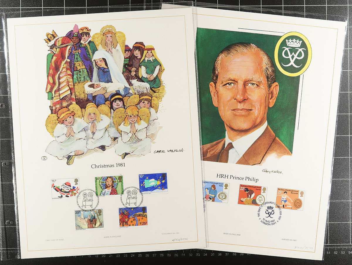 Large sized lithographed prints, with matching stamps and first day cancels. 28 different British panels (1979-1983), plus 5 from Guernsey and 1 from the Isle of Man. Each is housed in a specialty 4-hole plastic pouch. Some of the plastic pages have warped, but only one of the panels is damaged (unrelated to the condition of the plastic). Each is a limited production of 9500. We haven’t seen these catalogued and the lowest prices that we have seen online is $10.00 each. Estimate =