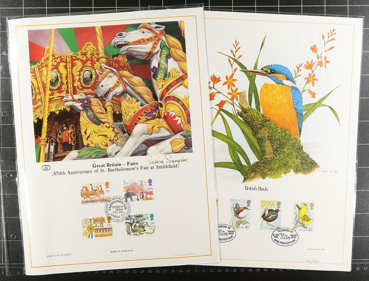 Large sized lithographed prints, with matching stamps and first day cancels. 28 different British panels (1979-1983), plus 5 from Guernsey and 1 from the Isle of Man. Each is housed in a specialty 4-hole plastic pouch. Some of the plastic pages have warped, but only one of the panels is damaged (unrelated to the condition of the plastic). Each is a limited production of 9500. We haven’t seen these catalogued and the lowest prices that we have seen online is $10.00 each. Estimate =