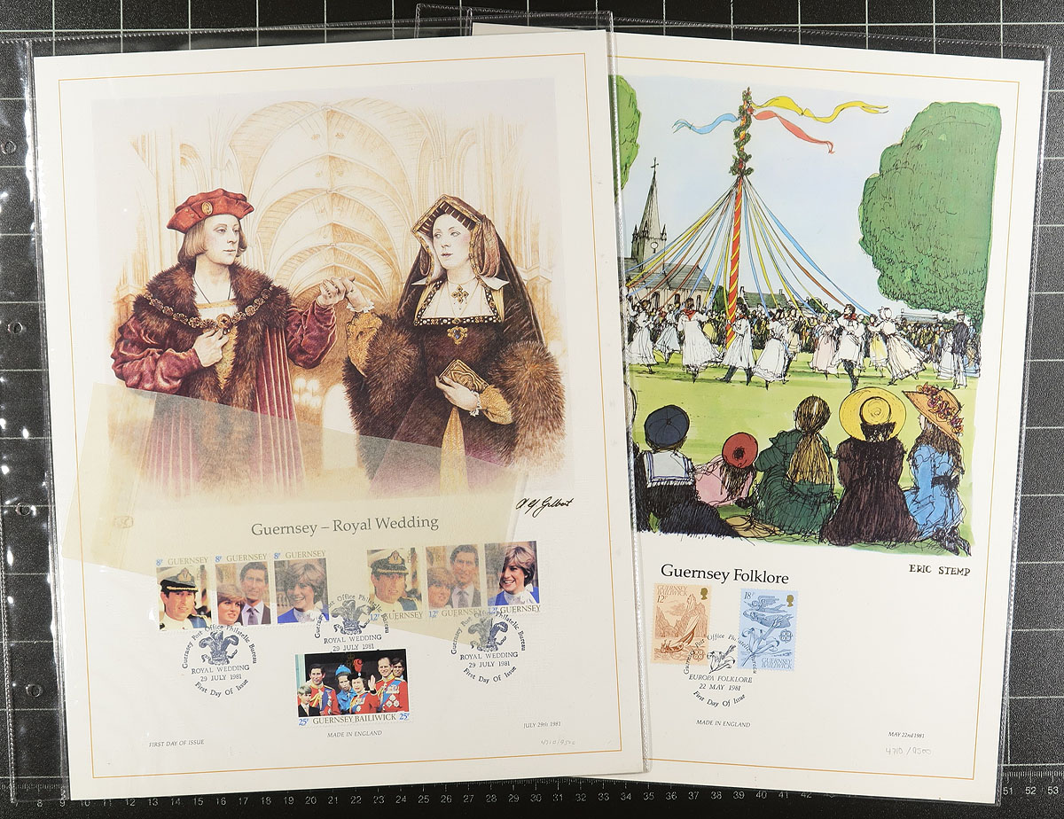 Large sized lithographed prints, with matching stamps and first day cancels. 28 different British panels (1979-1983), plus 5 from Guernsey and 1 from the Isle of Man. Each is housed in a specialty 4-hole plastic pouch. Some of the plastic pages have warped, but only one of the panels is damaged (unrelated to the condition of the plastic). Each is a limited production of 9500. We haven’t seen these catalogued and the lowest prices that we have seen online is $10.00 each. Estimate =