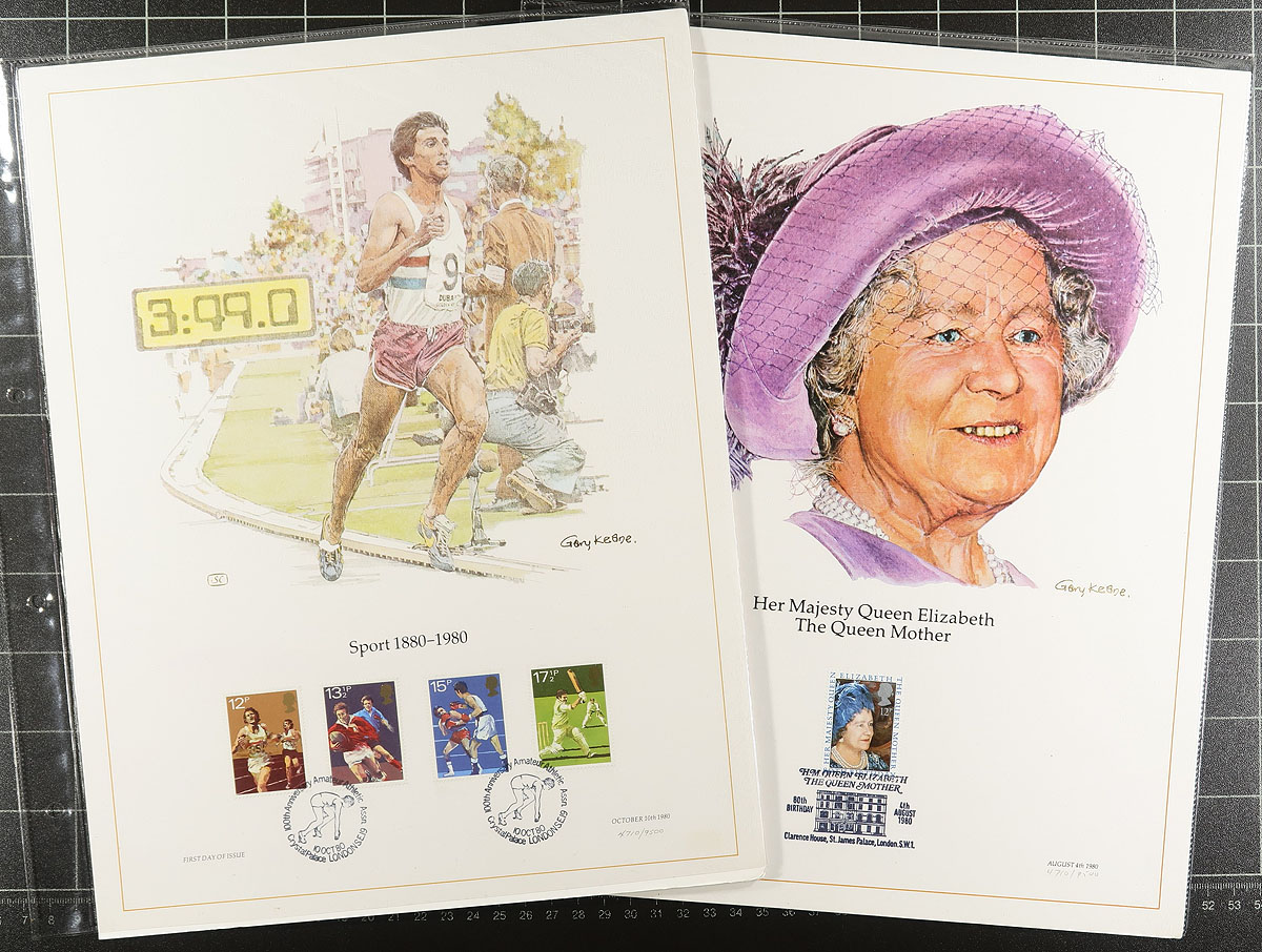 Large sized lithographed prints, with matching stamps and first day cancels. 28 different British panels (1979-1983), plus 5 from Guernsey and 1 from the Isle of Man. Each is housed in a specialty 4-hole plastic pouch. Some of the plastic pages have warped, but only one of the panels is damaged (unrelated to the condition of the plastic). Each is a limited production of 9500. We haven’t seen these catalogued and the lowest prices that we have seen online is $10.00 each. Estimate =
