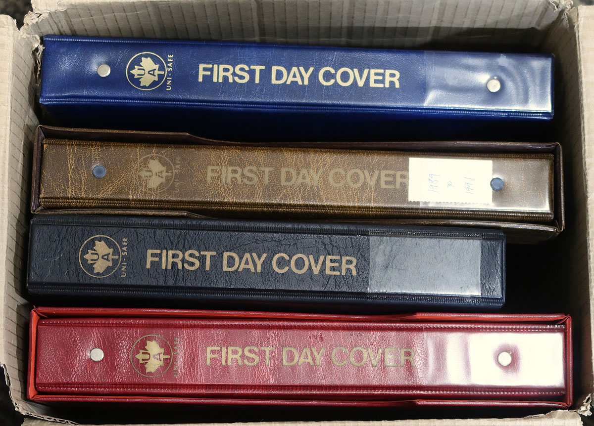 Four Uni-Safe FDC albums filled with (mostly) Canada Post unaddressed, cacheted first day covers. From 1971 to 1998 (strongest in the last decade). Includes some plate blocks, higher values in an assortment of near-new single and double cover albums. The original face value of the stamps alone is almost $400.00, with no premium for the albums. Some minor duplication. Estimate =