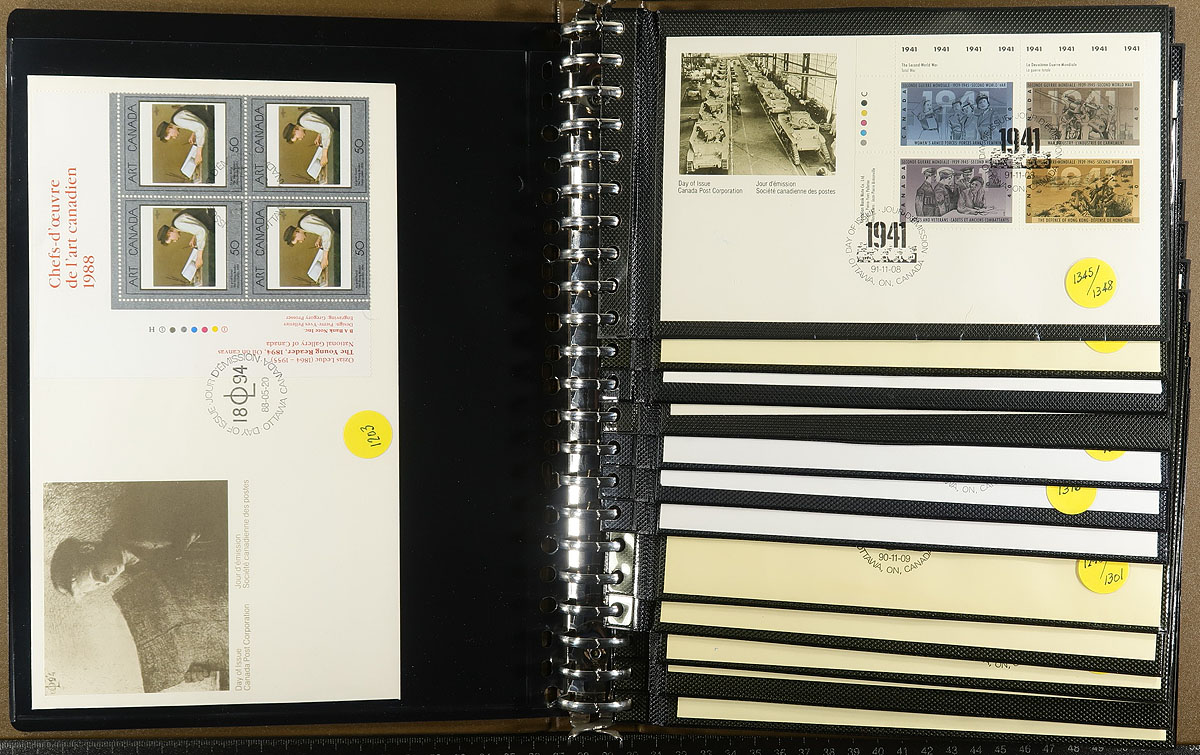 Four Uni-Safe FDC albums filled with (mostly) Canada Post unaddressed, cacheted first day covers. From 1971 to 1998 (strongest in the last decade). Includes some plate blocks, higher values in an assortment of near-new single and double cover albums. The original face value of the stamps alone is almost $400.00, with no premium for the albums. Some minor duplication. Estimate =