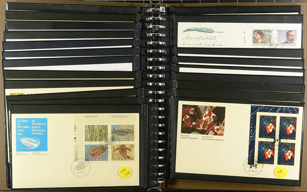 Four Uni-Safe FDC albums filled with (mostly) Canada Post unaddressed, cacheted first day covers. From 1971 to 1998 (strongest in the last decade). Includes some plate blocks, higher values in an assortment of near-new single and double cover albums. The original face value of the stamps alone is almost $400.00, with no premium for the albums. Some minor duplication. Estimate =