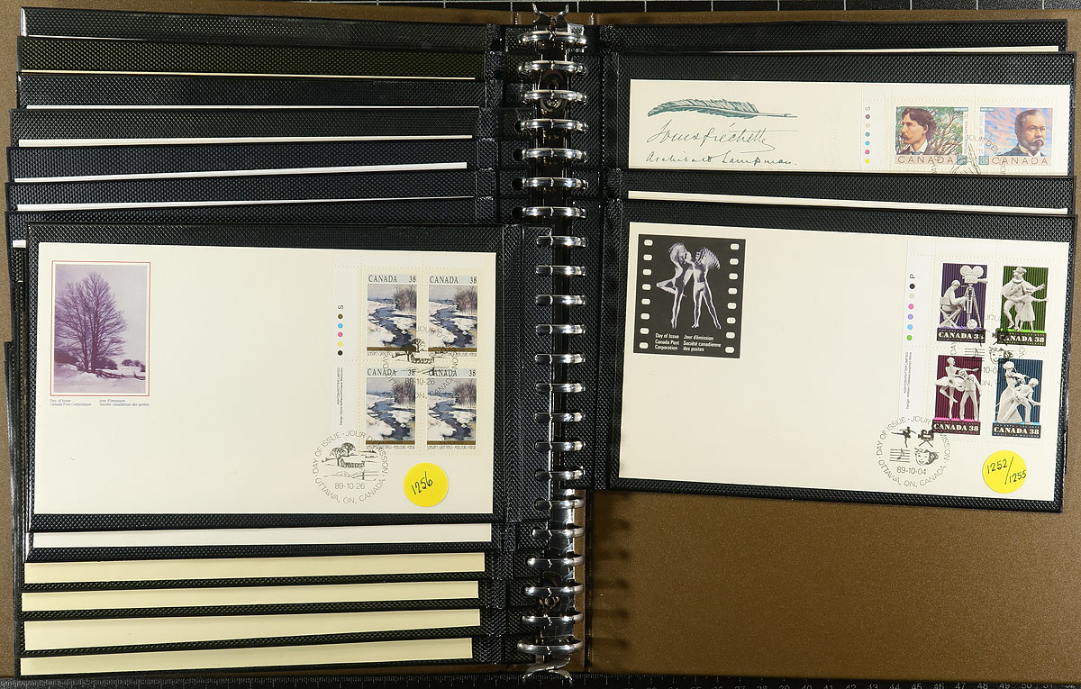 Four Uni-Safe FDC albums filled with (mostly) Canada Post unaddressed, cacheted first day covers. From 1971 to 1998 (strongest in the last decade). Includes some plate blocks, higher values in an assortment of near-new single and double cover albums. The original face value of the stamps alone is almost $400.00, with no premium for the albums. Some minor duplication. Estimate =