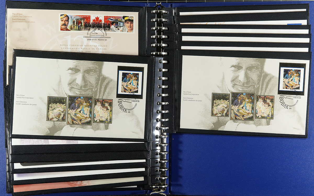 Four Uni-Safe FDC albums filled with (mostly) Canada Post unaddressed, cacheted first day covers. From 1971 to 1998 (strongest in the last decade). Includes some plate blocks, higher values in an assortment of near-new single and double cover albums. The original face value of the stamps alone is almost $400.00, with no premium for the albums. Some minor duplication. Estimate =