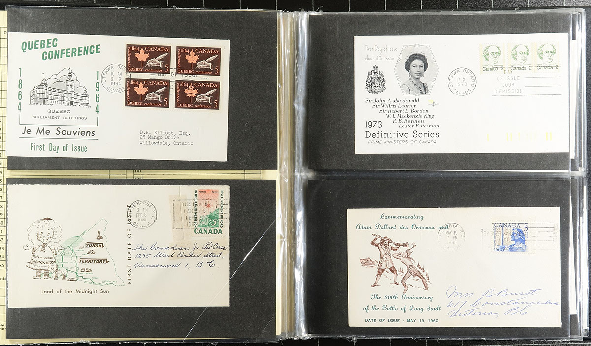 Four Uni-Safe FDC albums filled with (mostly) Canada Post unaddressed, cacheted first day covers. From 1971 to 1998 (strongest in the last decade). Includes some plate blocks, higher values in an assortment of near-new single and double cover albums. The original face value of the stamps alone is almost $400.00, with no premium for the albums. Some minor duplication. Estimate =