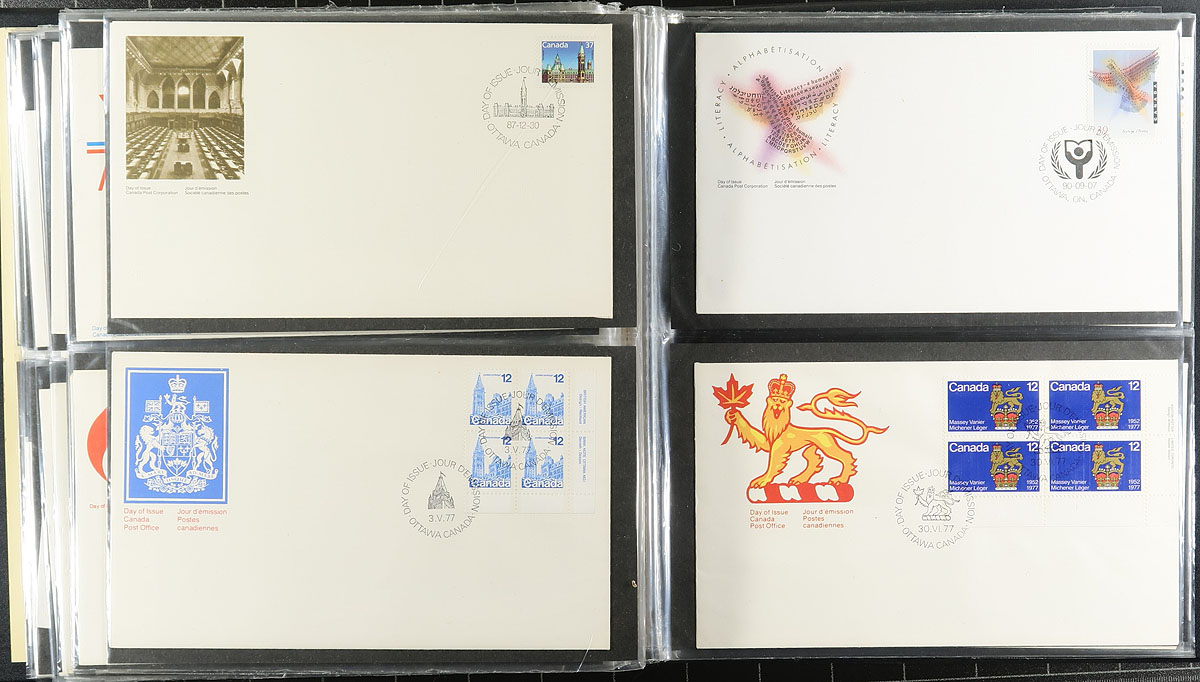 Four Uni-Safe FDC albums filled with (mostly) Canada Post unaddressed, cacheted first day covers. From 1971 to 1998 (strongest in the last decade). Includes some plate blocks, higher values in an assortment of near-new single and double cover albums. The original face value of the stamps alone is almost $400.00, with no premium for the albums. Some minor duplication. Estimate =