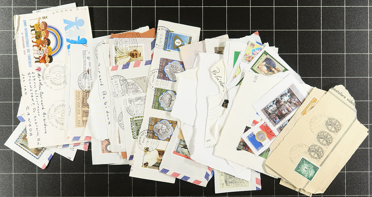 A bundle of assorted stamps and covers. A mint, mounted collection in a springback binder covers 1949-1983. There is a good-sized bag of loose mostly used stamps, both on and off paper. The covers include the usual philatelic offerings, plus some better (silk cachets on FDC, registered covers and more commercial mail than normally seen). The last section is a group from the "Order of Malta" with covers and souvenir sheets, most of the first 60 issues from this non-Scott listed "adjunct" issuer (European catalogue value over €225.00). Not your usual working lot of Vatican. Estimate =