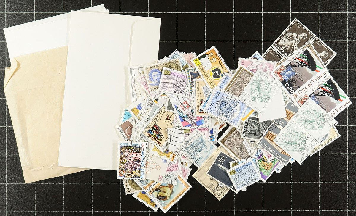 A bundle of assorted stamps and covers. A mint, mounted collection in a springback binder covers 1949-1983. There is a good-sized bag of loose mostly used stamps, both on and off paper. The covers include the usual philatelic offerings, plus some better (silk cachets on FDC, registered covers and more commercial mail than normally seen). The last section is a group from the "Order of Malta" with covers and souvenir sheets, most of the first 60 issues from this non-Scott listed "adjunct" issuer (European catalogue value over €225.00). Not your usual working lot of Vatican. Estimate =